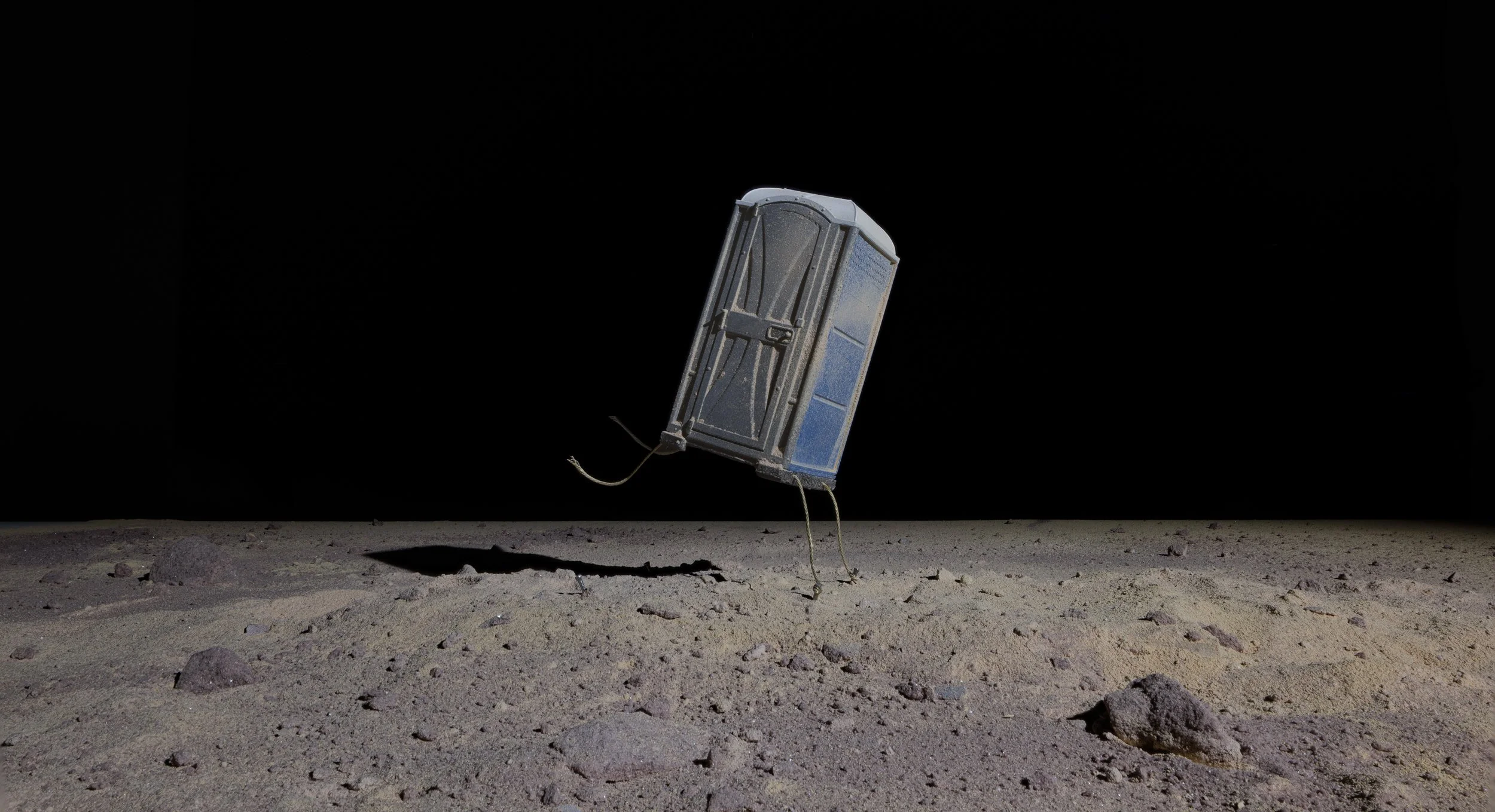 Stripped from its steel tethers by a ferocious Martian sandstorm, the portable public convenience drifts helplessly, declared “out of order” in a landscape where it was never in order to begin with.