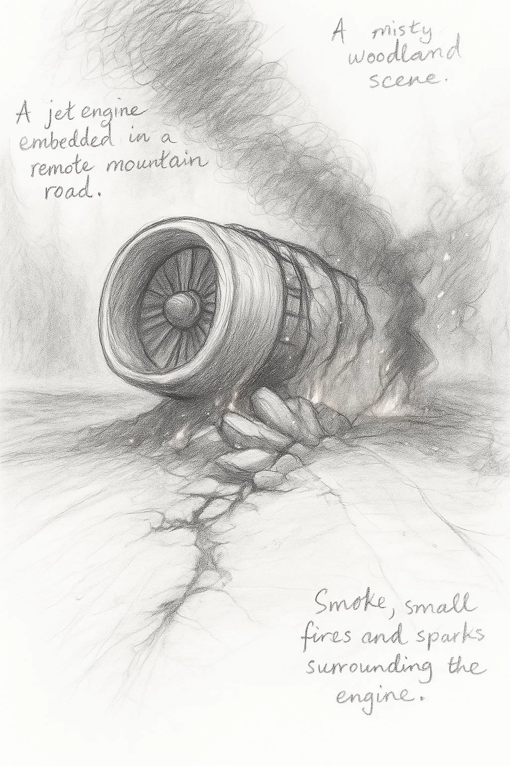 The forest is still, the air thick with mist and the acrid bite of smoke. In the middle of the deserted road lies a jet engine, half-buried in cracked asphalt, steam curling from it like breath in the cold. Its metal housing glows faintly, heat radiating from its violent arrival.